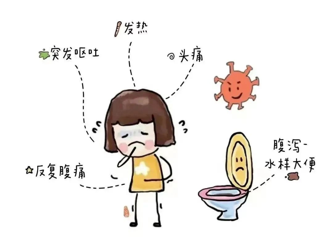 ● 腹泻、腹痛、恶心、呕吐,可伴有低热、头痛、乏力及食欲减退。 ● 粪便为黄色浠水便,患者经常无预兆剧烈呕吐,呕吐物有感染性,成人腹泻较突出,儿童呕吐较多。 ● 诺如病毒潜伏期为24~48小时,病程为自限性,一般2~3天即可恢复。● 注意饮食、饮水卫生,尽量吃熟食,吃水果要清洗、削皮,饮用开水或未开封的预包装水、饮料。● 勤洗手,尤其是饭前便后,减少到人群聚集的地方,保持空气流通。● 出现呕吐、腹泻等肠胃症状,应尽早到医院就诊。切勿送到幼儿园,患儿应隔离至症状消失后三天。