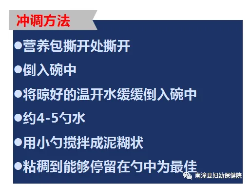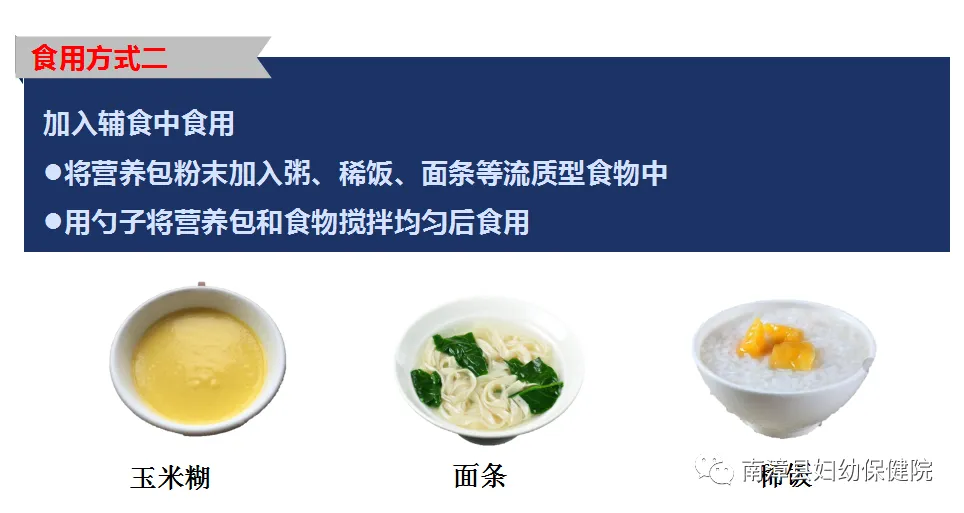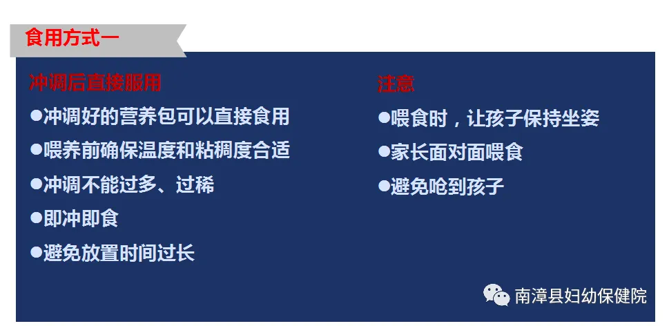 冲调后直接食用,或者将冲调好的营养糊加入稀饭、面条、玉米糊等辅食中,搅拌均匀,喂给孩子吃。要根据孩子的饭量加营养包,要保证让孩子吃完加了营养包的饭,不要浪费。