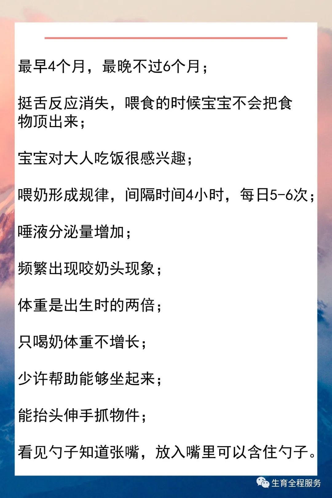 WHO的建议是纯母乳喂养6个月,满6月龄起添加辅食。 欧洲的建议是17~36周之间,纯母乳喂养6个月是理想目标。 美国的建议则是4~6个月之间。不同国家地区会按照自己国家的情况给出不同的推荐建议。 各位妈妈可以根据下文提到的判定条件来确定添加的时间,但不建议早于4个月或晚于6个月)。