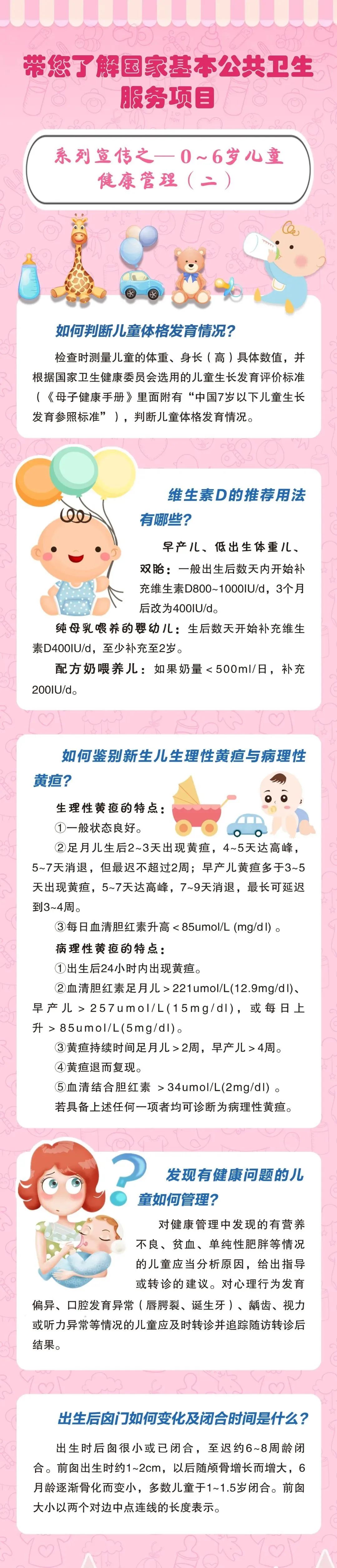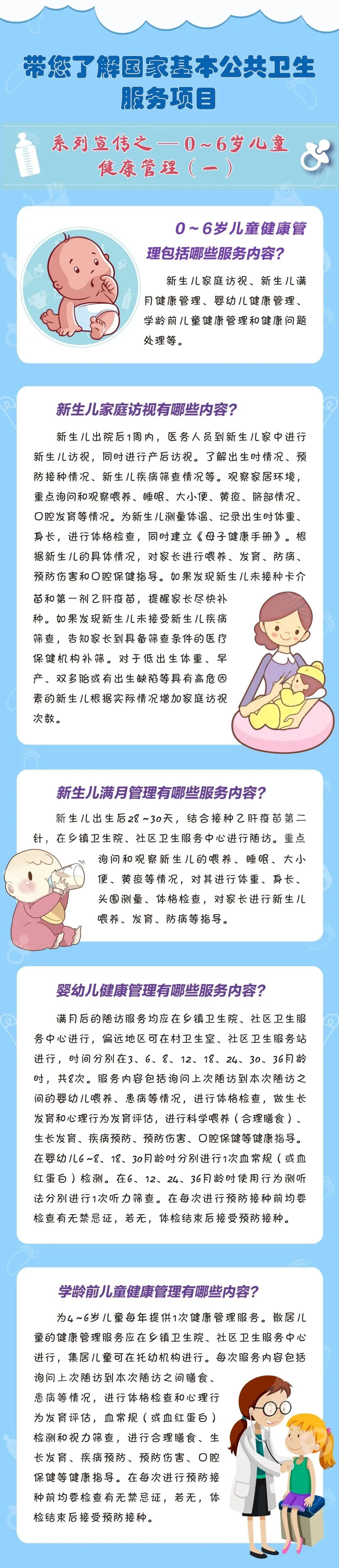 每一个新生宝宝都寄托了一个新的希望,让孩子定期接受儿童保健服务,是孩子健康成长的重要保障。孩子从出生到满6周岁,可以享受由妇幼保健院/社区卫生服务中心/镇卫生院提供的13次免费健康检查和指导服务,有助于动态监测宝宝的生长发育状况,促进宝宝健康成长。