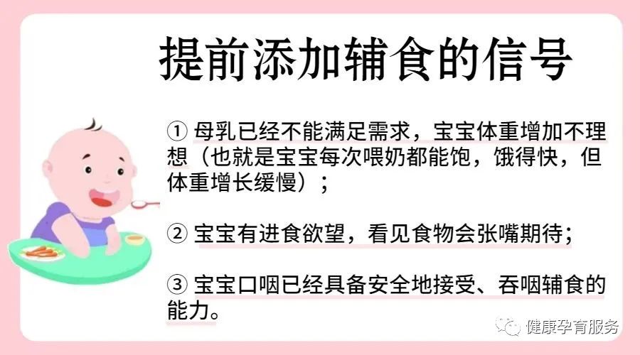 但,不一定要等到宝宝满6个月才能添加辅食,当他出现以下3种情况时,你可以提前添加,但不能早于4个月。