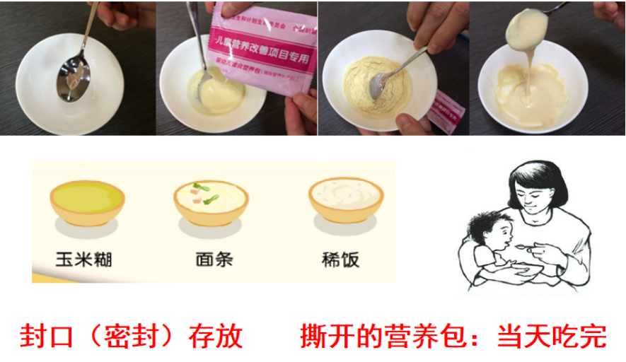 ●不肯吃不爱吃:个别孩子初次食用不适应营养包口感或冲调方法不当或对妈妈依恋等原因,予以坚定信心、少量多次试喂、帮助孩子克服“恐新”;改变添加方法,如放进孩子喜欢的食物中,或把一袋分成几次吃完、加到少量食物中;变换喂食的家长。