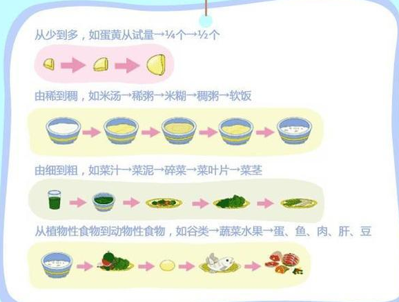 早期添加的辅食是细软的泥糊状食物,逐步过渡到粗颗粒的半固体食物,再到较大的团块状固体食物。