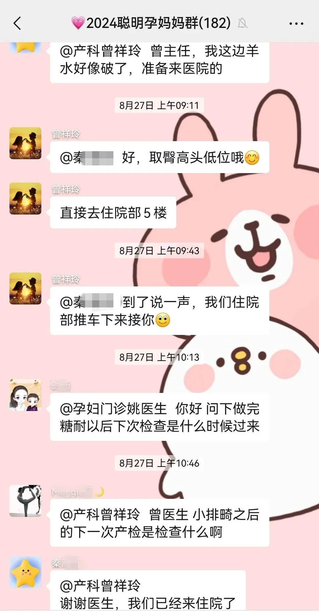 8月27日早上九点左右,妇产科主任曾祥玲在孕妈妈群里收到了秦女士的微信求助,获悉其羊水已破。曾祥玲当即迅速回复,给予了专业的指导,叮嘱其迅速来院安全分娩,并安排助产士在住院部楼下接应。孕妇抵达医院后,快速地办理了住院手续。经过检查,秦女士有临产的先兆,宫颈成熟度评分及骨盆条件甚佳,顺产的可能性极大。