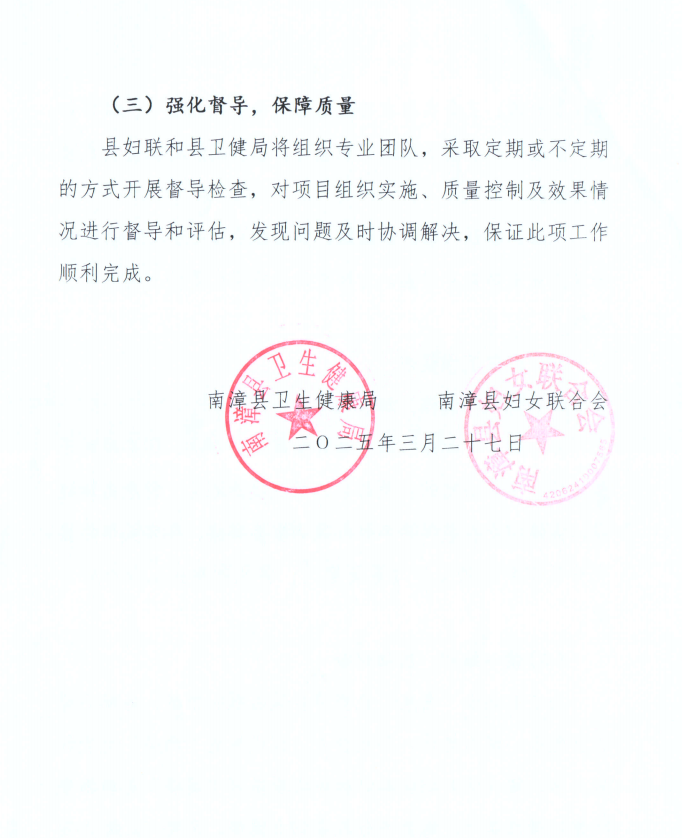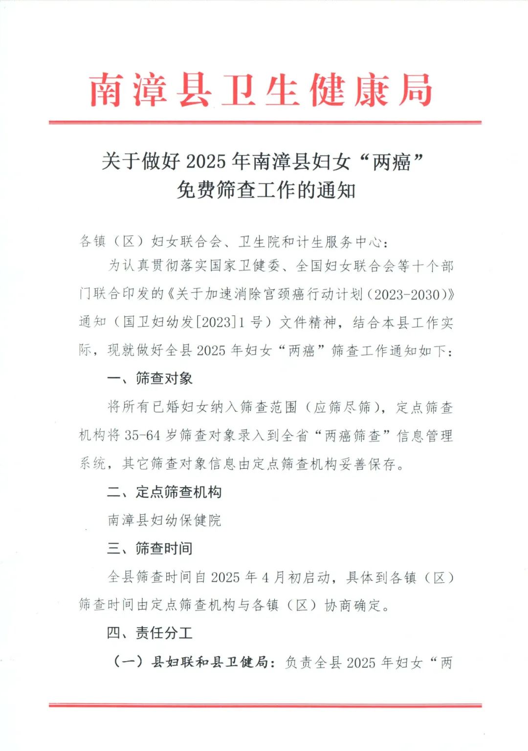 南漳县卫生健康局、南漳县妇女联合会联合印发《关于做好2025年南漳县妇女“两癌”免费筛查工作的通知》,安排部署了2025年度女”两癌“免费筛查工作,此项工作由县妇幼保健院具体承担。