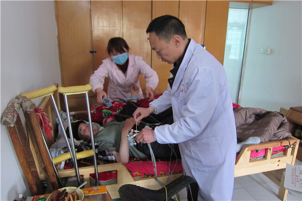 工作人员逐一为老人做心电图检查